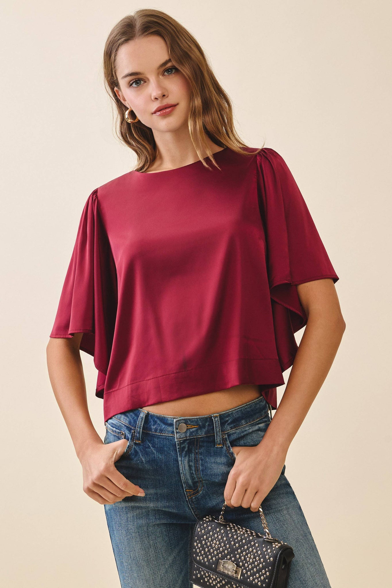 A satin top featuring a round neckline and short flutter sleeves. Designed with a relaxed, boxy fit and a back keyhole closure. Finished with a slightly cropped hem.