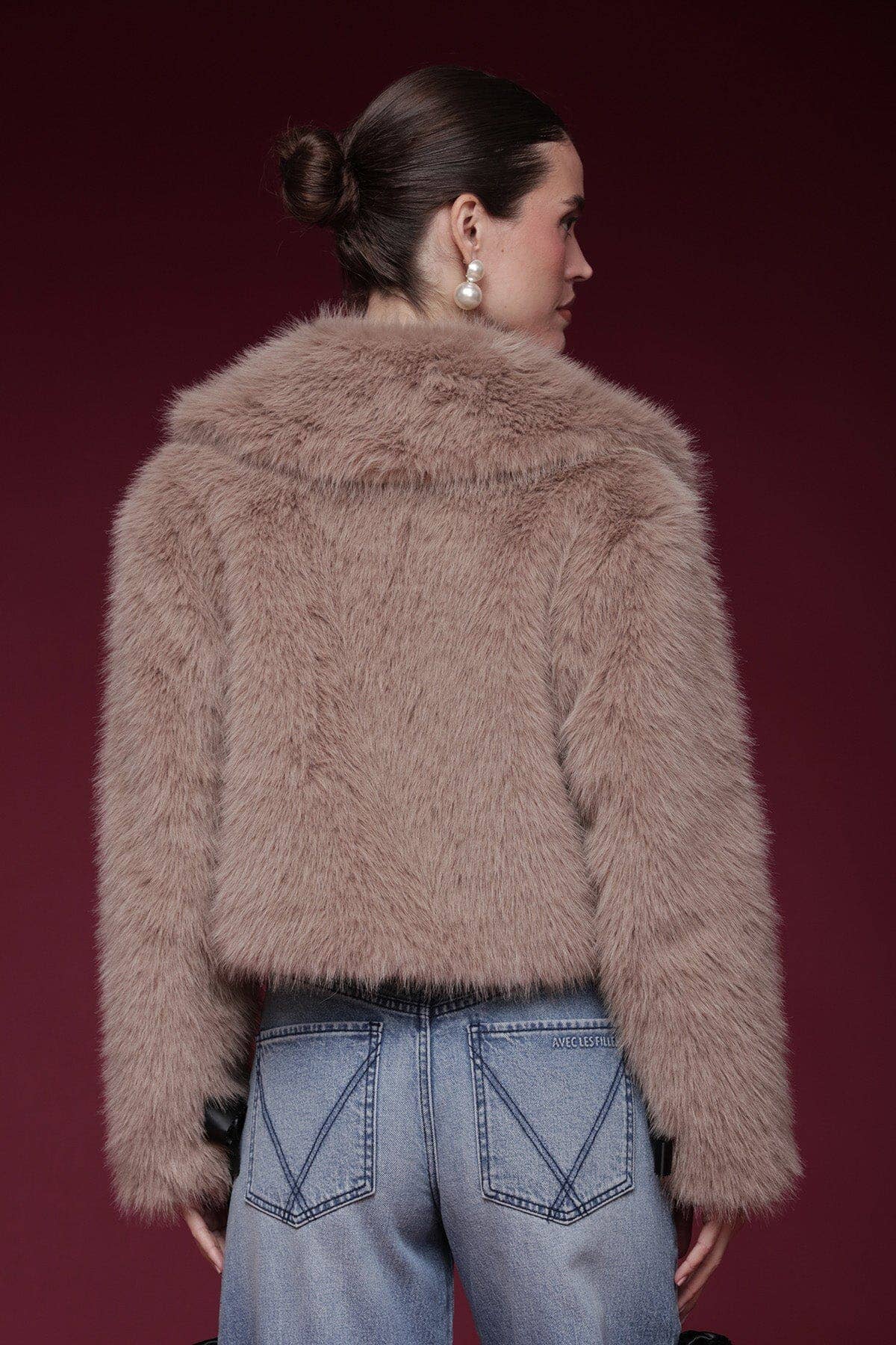 Sleek and versatile, this cropped faux fur jacket is reimagined in a rich taupe hue that works seamlessly from day to night. Its plush texture and oversized collar offer elevated warmth, while the clean, solid finish makes it endlessly easy to style — from off-duty denim to evening sequins.