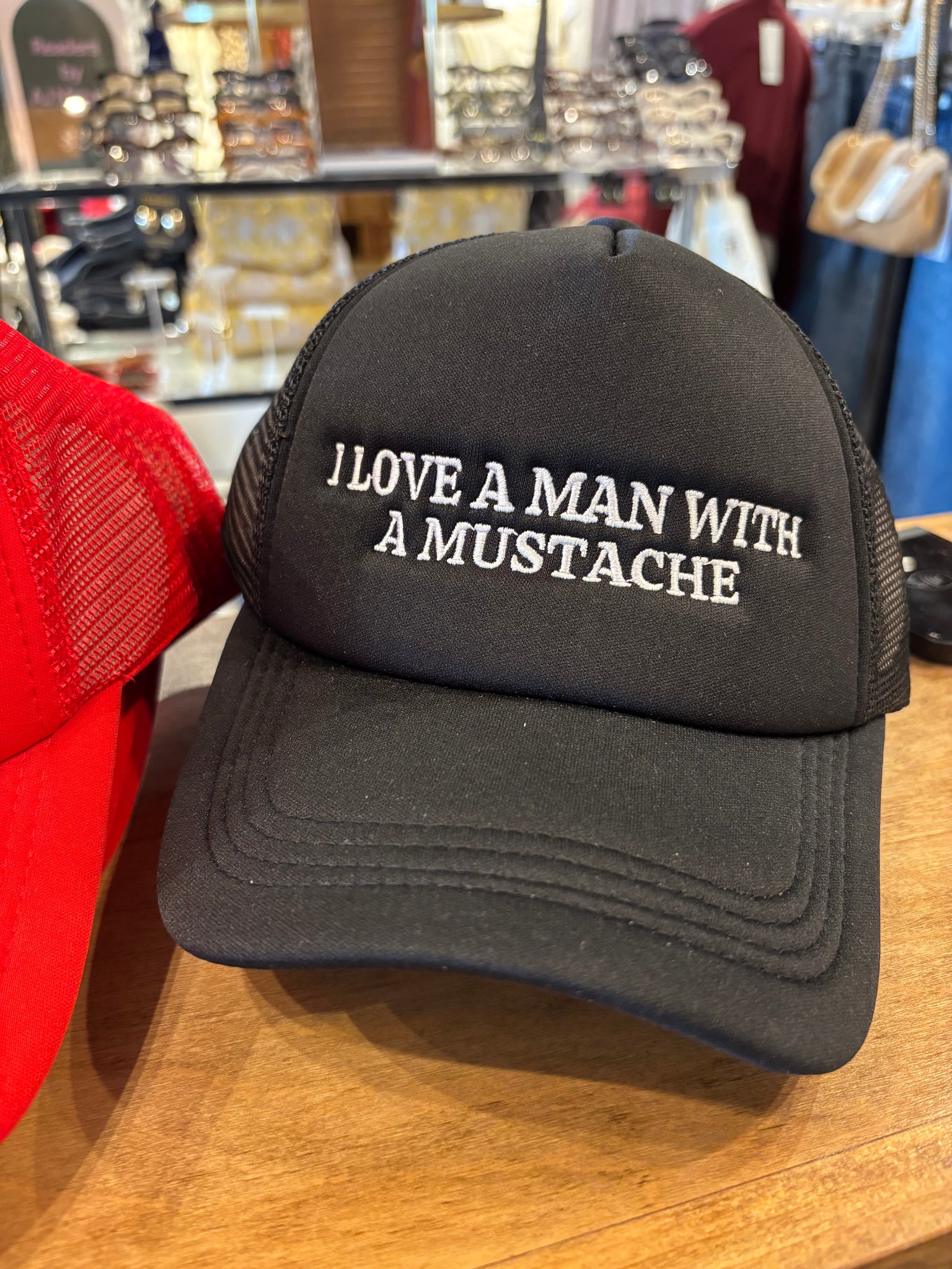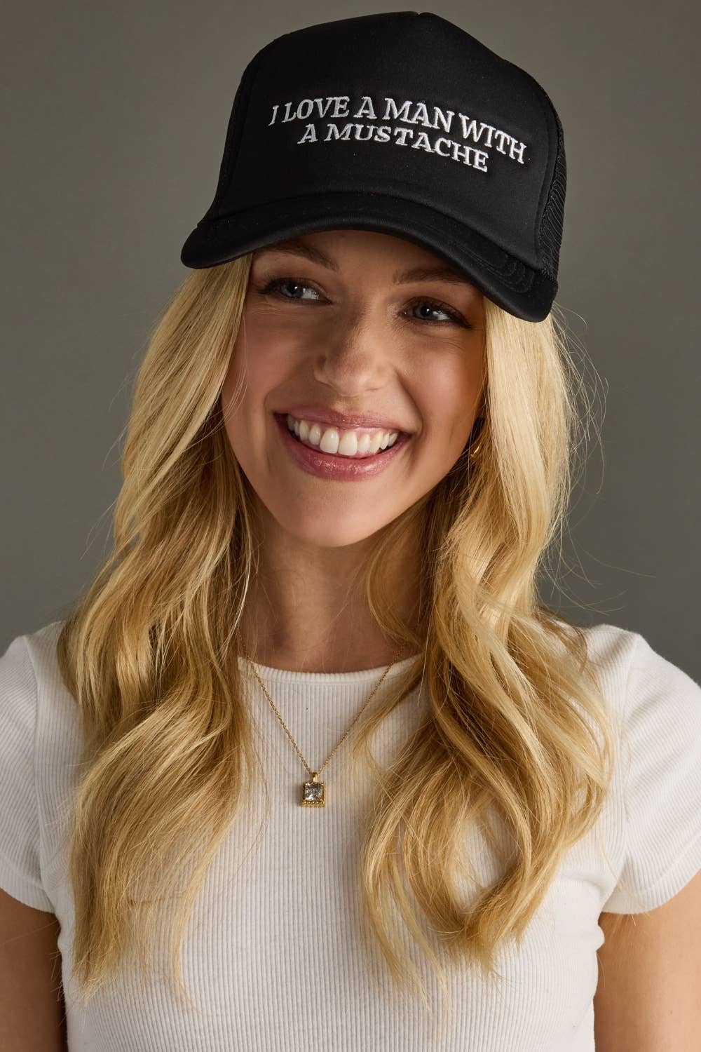 Black trucker hat White "I love a man with a mustache" on front 100% Polyester Adjustable snapback closure Breathable mesh Min. Qty. 2
