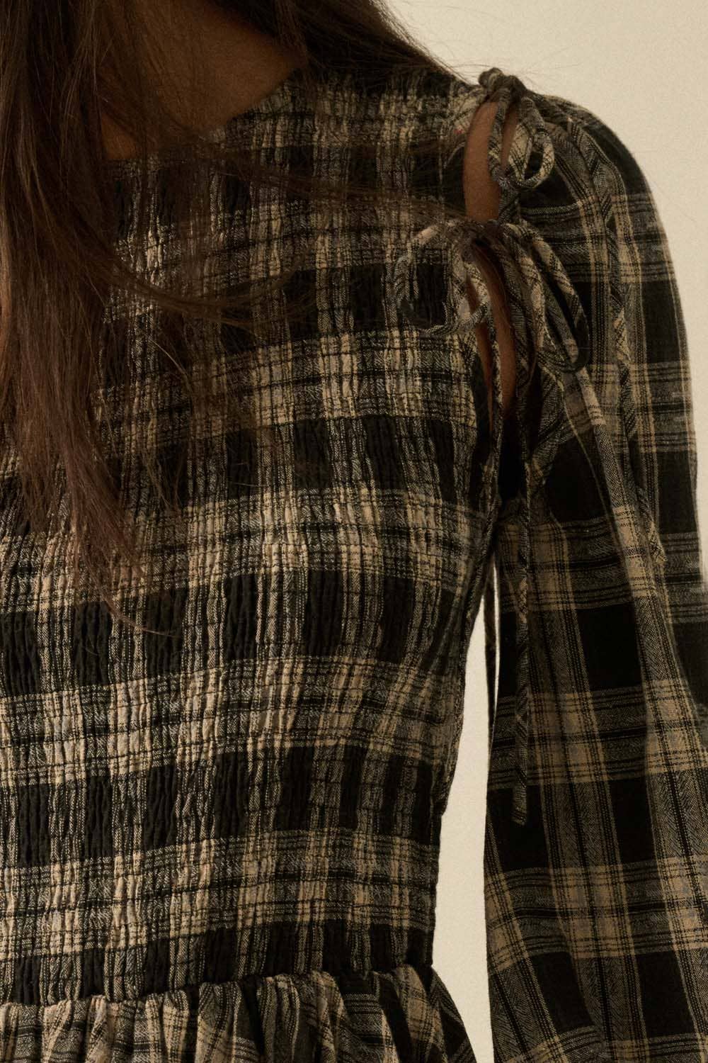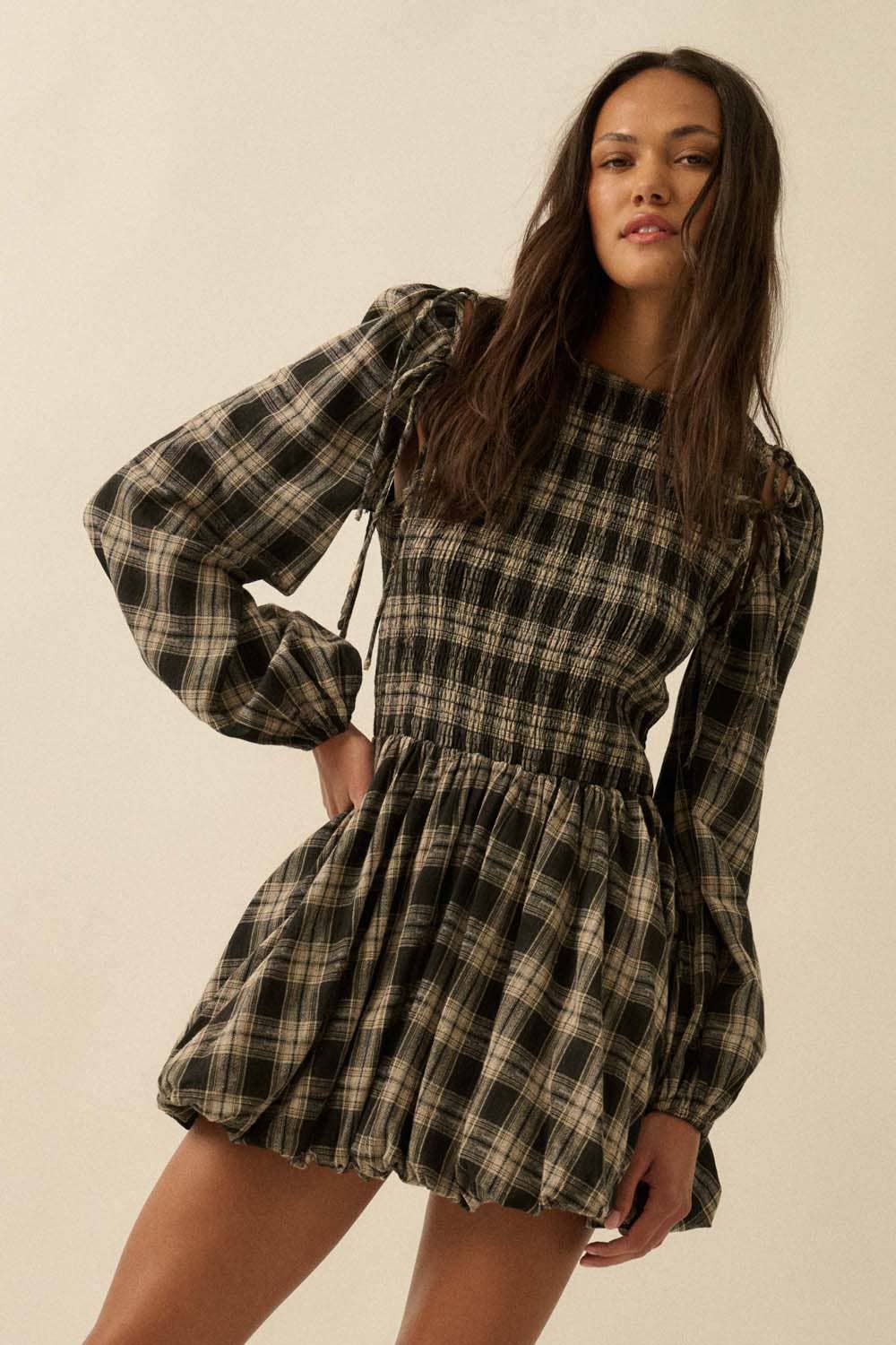 A plaid flannel mini dress with the following features: