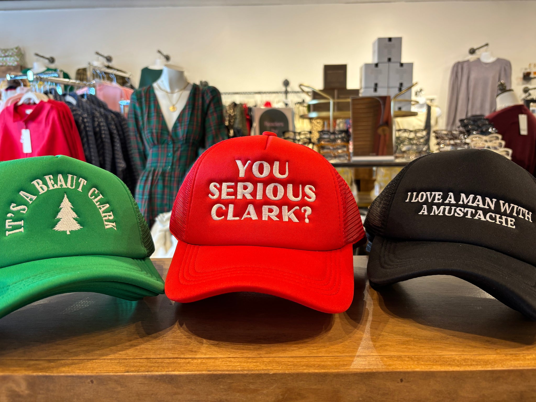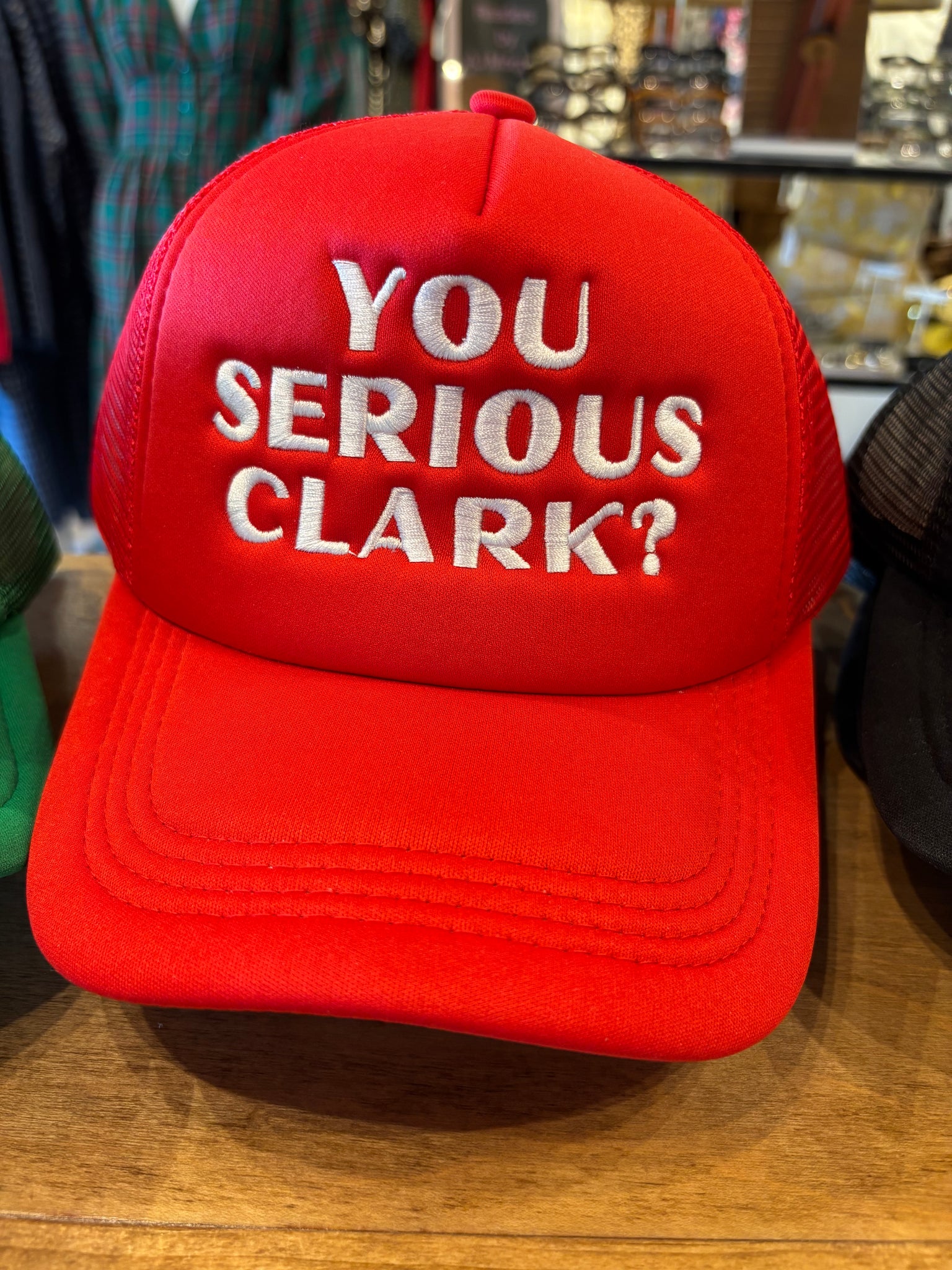 Red trucker hat White "You serious Clark?" on the front Adjustable snapback closure Breathable mesh 100% Polyester Min. Qty. 2